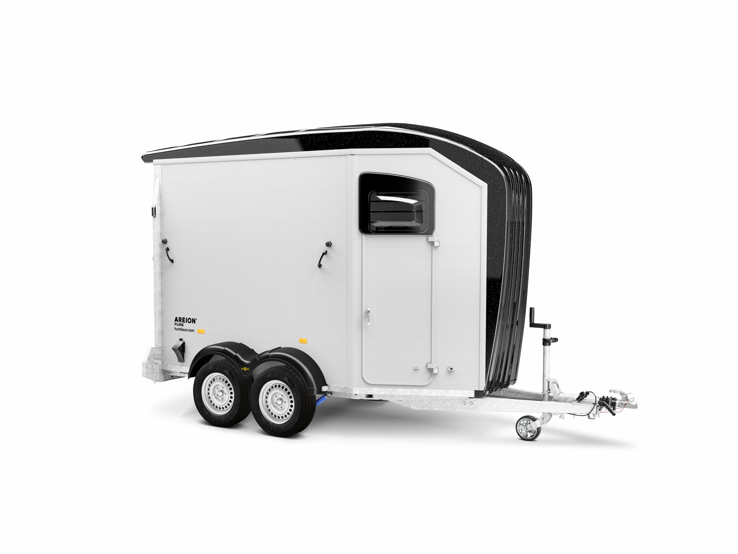 • Abschließbare Sattelkammer mit ausziehbarem Sattelhalter, Trensenhalter, Spiegel, Netz, Innenbeleuchtung, Schaufel und Besen