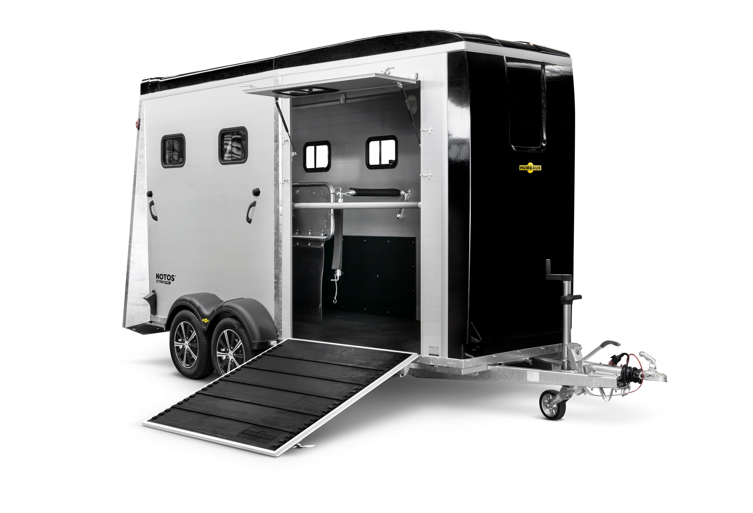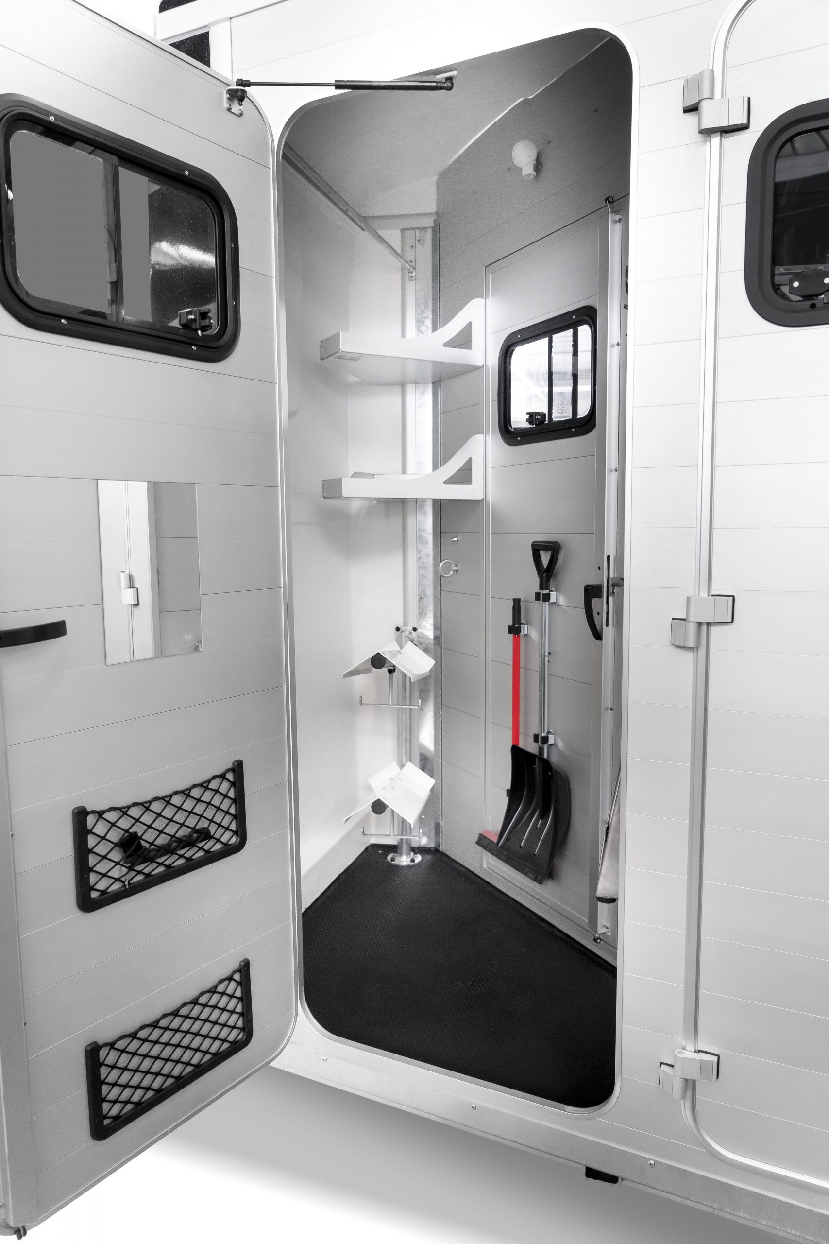 - Mannshohe Einstiegstüre rechts mit Schiebefenster(entfällt bei Frontausstieg rechts) in den Pferderaum und mannshohe Einstiegstüre links mit Schiebefenster in den Sattelraum